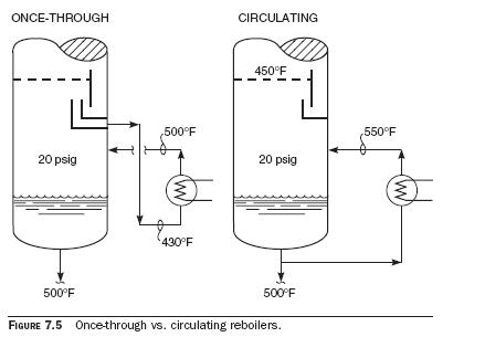 • The once-through reboiler functions as the bottom theoretical separation stage of the tower. The circulating reboiler does not, because a portion of its effluent back mixes to its feed inlet. This back mixing ruins the separation that can otherwise be achieved in reboilers.