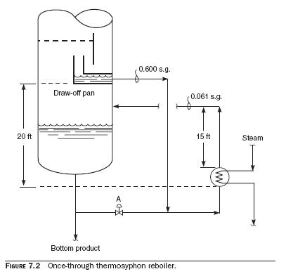 Figure 7.2 shows a once-through thermosyphon reboiler. The driving force to promote flow through this reboiler is the density difference between the reboiler feed line and the froth filled reboiler return line. For example: