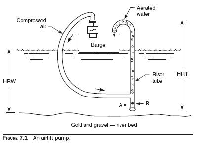The theory of thermosyphon, or natural circulation, can be illustrated by the airlift pump shown in Fig. 7.1. This system is being used to recover gold bearing gravel from the Magdalena River in Colombia, South America. Compressed air is forced to the bottom of the river through the air line. The air is injected into the bottom of the riser tube. The aerated water in the riser tube is less dense than the water in the river. This creates a pressure imbalance between points A and B. Since the pressure at point B is less than that at point A, water (as well as the gold and gravel) is sucked off the bottom of the river and up into the riser tube. We can calculate the pressure difference between points A and B as follows: