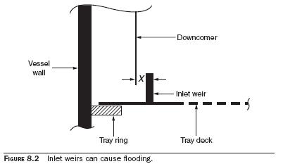 Most trays have outlet weirs devoted to maintaining the downcomer seal. But some trays have inlet weirs too, or inlet weirs, but no outlet weirs. A sketch of an inlet weir is shown in Fig. 8.2. Note the horizontal distance between the downcomer and the inlet weir (dimension x). This distance ought to be equal to or greater than the downcomer clearance—that is, the vertical space between the tray floor and the bottom edge of the downcomer. Unfortunately, a small deformation of the downcomer may push the downcomer quite close to the inlet weir. The resulting reduction in the horizontal clearance between the inlet weir and the downcomer will restrict the liquid flow. This will cause downcomer backup and tray flooding of the trays above.