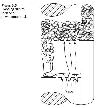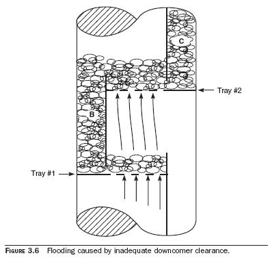 • If the downcomer clearance—which means the distance between the bottom edge of the downcomer and the tray below—is too great, the downcomer becomes unsealed. Vapor flows up the downcomer, and the trays above flood.